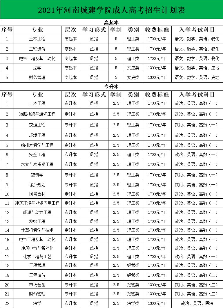 三、2021年河南城建学院成人高考报名招生专业