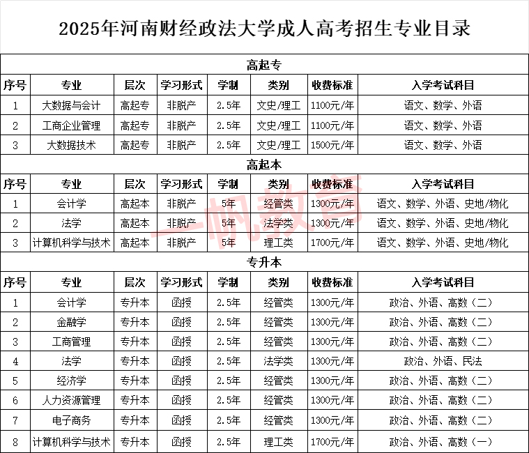 2025年河南财经政法大学成人高考招生专业: